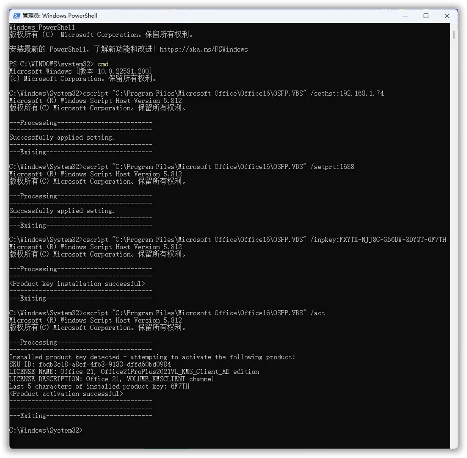 再以激活Office LTSC ProPlus 2021为例,使用三条命令激活。