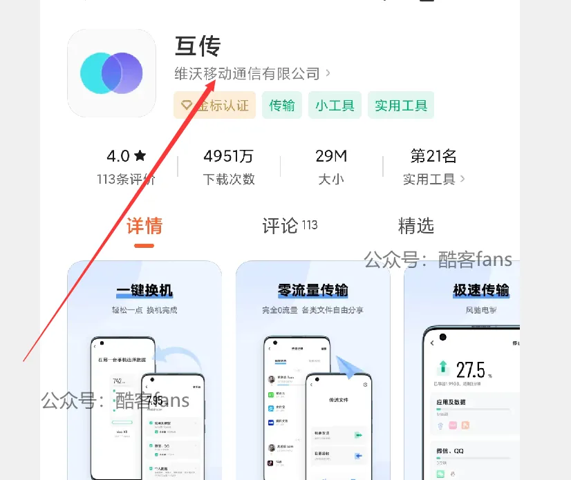 需要注意:苹果 App Store 里面有好几个图标跟 vivo官方「互传工具」非常像的同类型软件,千万不要下载错了,一定要认准软件开发者是维沃移动通信有限公司,软件名中带有“vivo官方换机工具”。