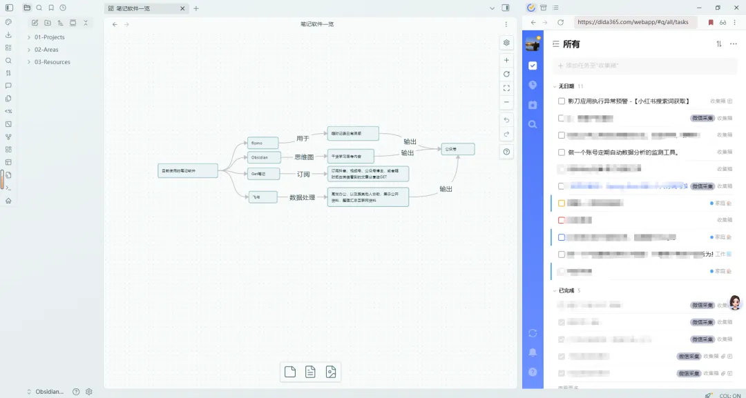 2、Obsidian(本地开源)本地开源笔记软件,在电脑上使用的多,通过云盘自动同步。主要用于学习知识、记笔记和画图。软件支持插件扩展,我安装了一些插件,用来画思维导图等,非常方便。(之前分享过,左边还是一堆资料,经过我昨晚的清理和转移,已经非常精简了)我会多开窗口,比如滴答清单和flomo。之前整理了一个obsidian教程: 小白必看!用PARA框架理清事项,让你的…