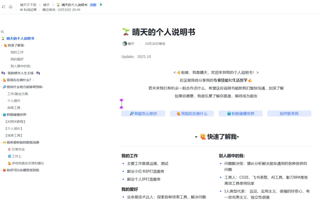 以小红书为例,我在运营小红书时,会把相关数据和笔记内容传到飞书的多维表格进行汇总、筛选,并通过AI进行改写,这样整理起来非常方便。主要是用于管理网上购买的资料信息,以及整理一些需要分享出去的互联网资料,比如我的这个人介绍就是用飞书写的(关注我主页会自动发你哦)。