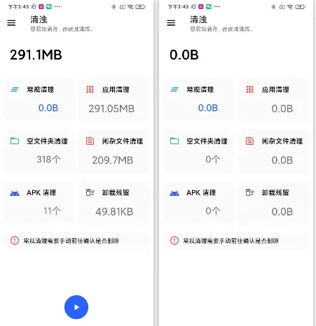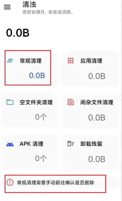 软件使用也不难,都是中文界面,各位朋友应该都能看懂,但是有个功能需要注意:常规清理这个需要我们手动选择删除,这个功能扫出来的有部分是APP的数据,直接删除可能会出问题。