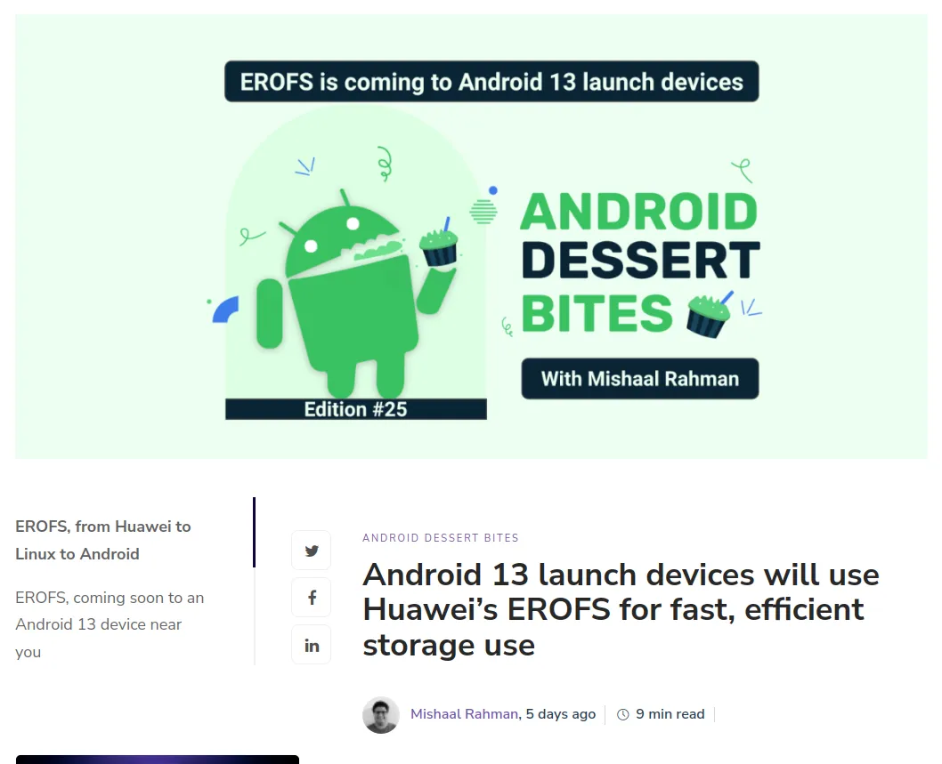 据 Esper 的 Mishaal Rahman 最新爆料,Android 13 正计划采用华为 EROFS 超级文件系统作为只读分区的默认文件系统。