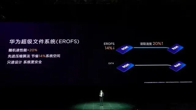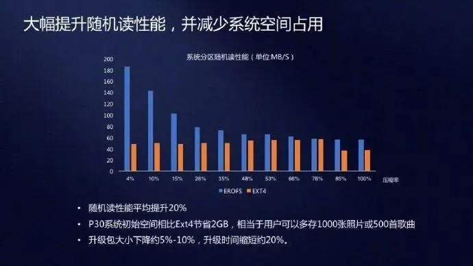 经过华为实测,能够使得系统分区随机读取性能平均提升 20%,并减少 14% 系统空间占用。而且它还有节省空间的优势,避免低内存情况下的卡顿等。