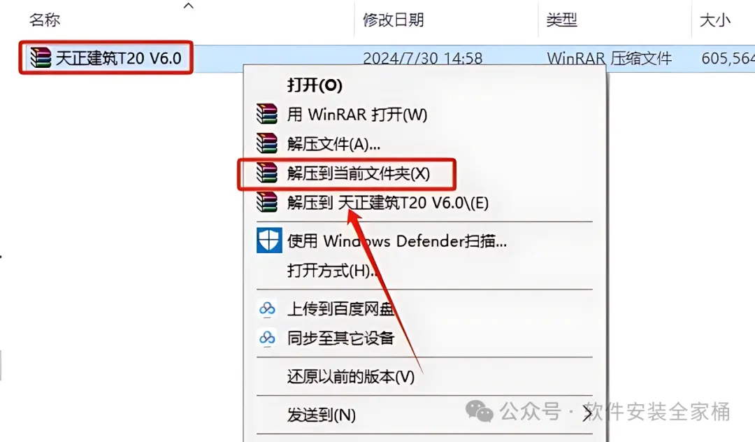 1.选中下载的天正建筑T20 V6.0安装包,鼠标右击选择【解压到当前文件夹】。