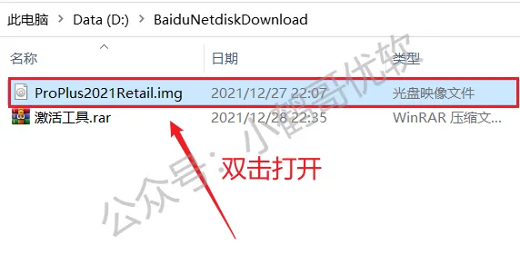 1.在电脑上下载安装文件,鼠标左键双击ProPlus2021Retail.img打开文件(安装程序在这个映像文件里)。