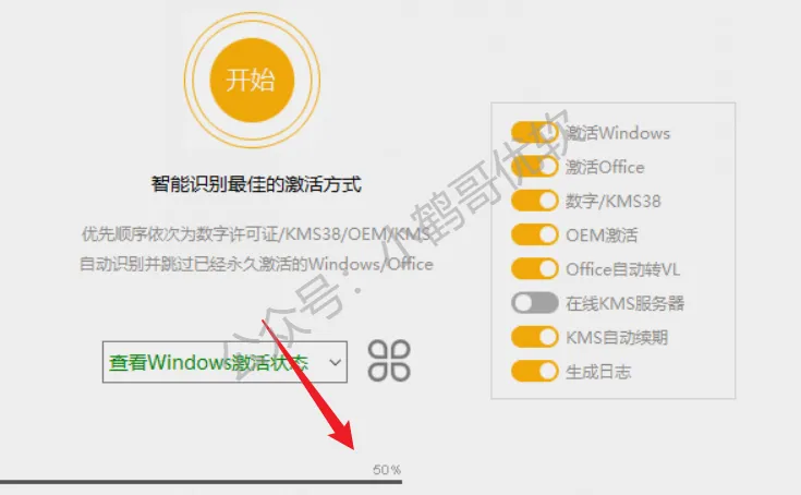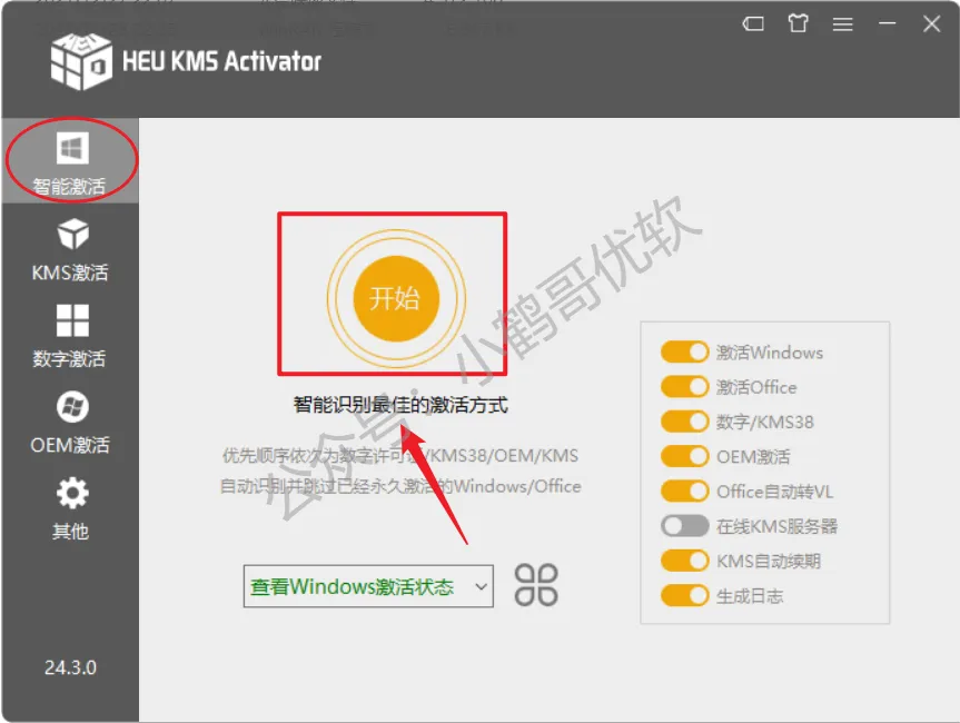 3.打开软件不需要更改什么复杂设置,我们用来激活office选择智能激活,直接点击开始按钮就可以自动识别激活了。
