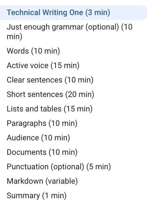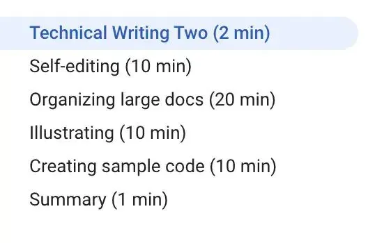 谷歌为软件工程师提供了免费的技术写作课程。课程从技术写作的基础部分开始,分为两个部分,内容如下: