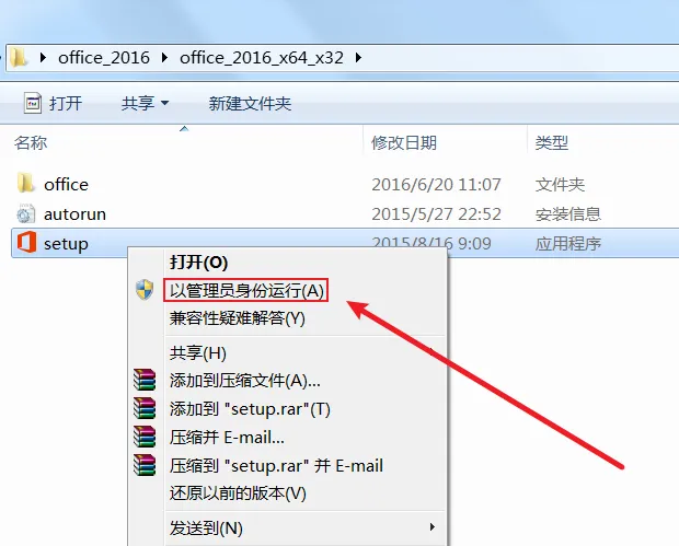 2、再进入到解压出来的“office_2016_x64_x32”文件夹内,找到“setup”文件,右击选择【以管理员身份运行】选项;