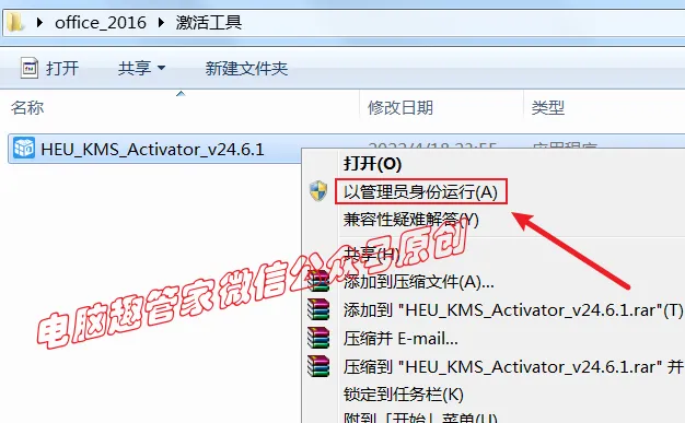 1、回到刚才解压好的激活工具文件夹,找到“HEU_KMS_Activator_v24.6.1”文件,右击选择【以管理员身份运行】选项;