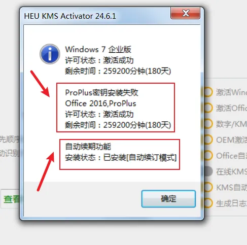 3、弹出“激活成功”界面,点击【确定】按钮,关闭激活工具即可(注:激活有效时间为180天,到期后自动续期也可手动操作续期,多次操作有效期不叠加。)。