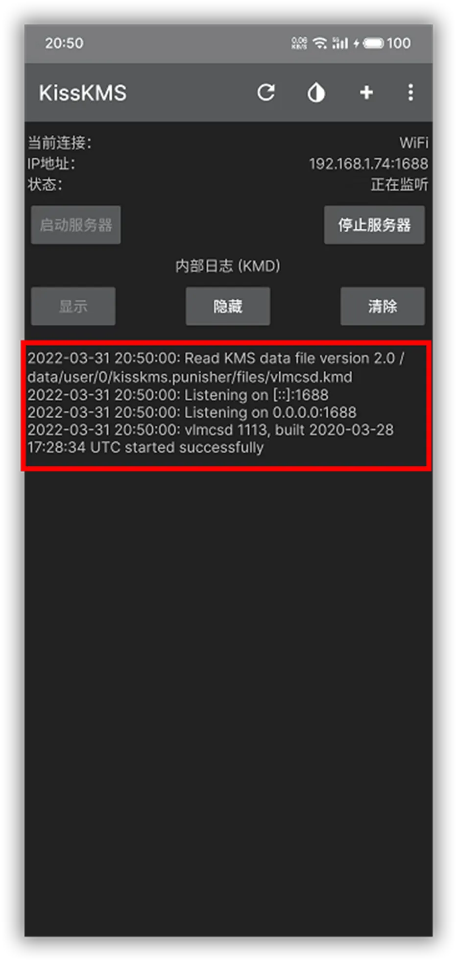连接好WiFi后,我们只需要点击一下“启动服务器”,这台KMS伺服器就已经搭建完成了。