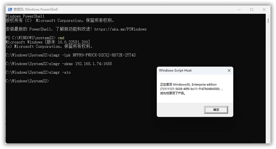 以激活Windows11企业版为例,使用三条命令激活。