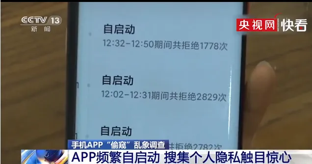 举个例子,有一款叫“优学院”的 App 在十几分钟内访问手机照片和文件近 25000 次,而另一款通讯软件“TIM”在一小时内尝试自启动近 7000 次。