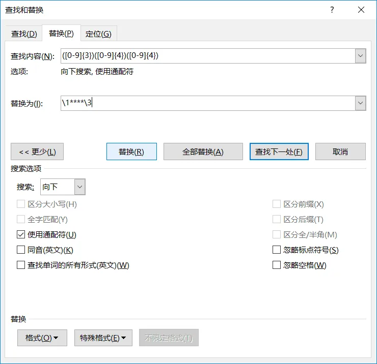 点击【更多】命令,勾选【使用通配符】选项,点击【特殊格式】中的【范围内的字符】。