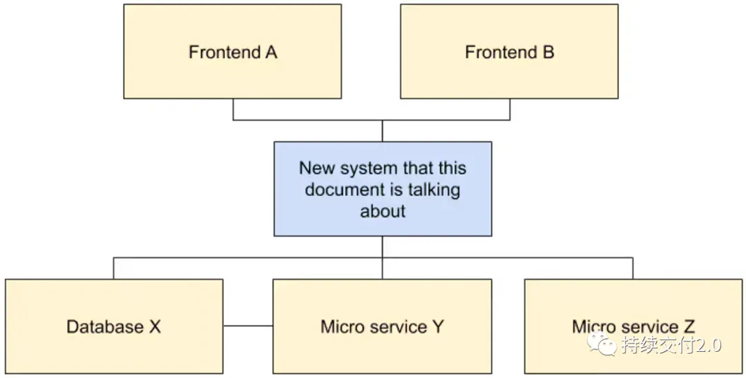 在许多文档中,系统上下文图(https://en.wikipedia.org/wiki/System_context_diagram) 可能非常有用。这样的图将系统显示为更大技术景观的一部分,并允许读者根据他们已经熟悉的环境对新设计进行语境化。