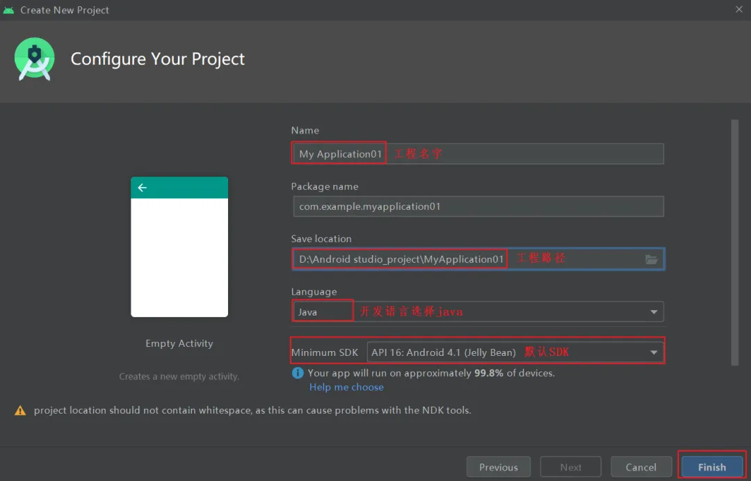按照图片的配置方法,设置好工程名和路径。