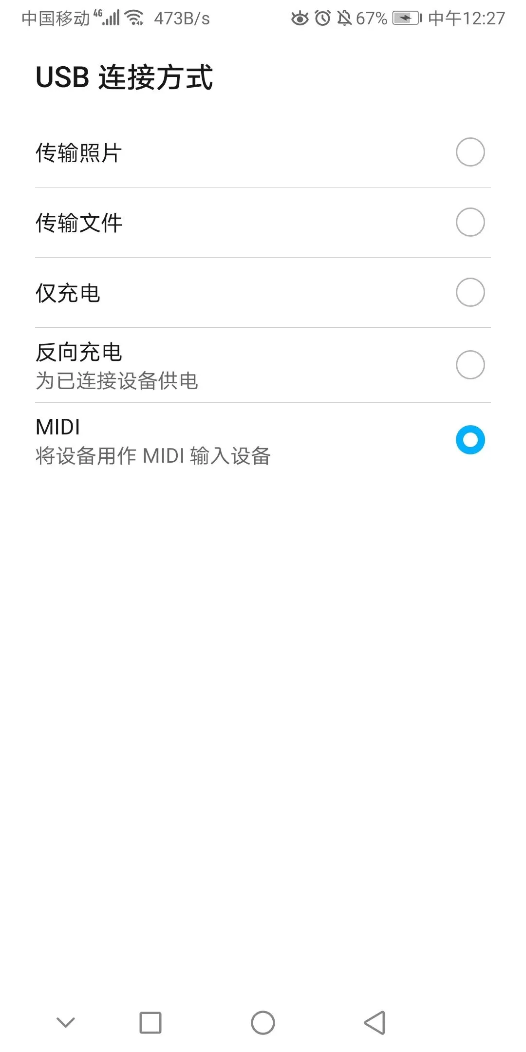 选择USB连接方式是MIDI(将设备用做MIDI输入设备) -