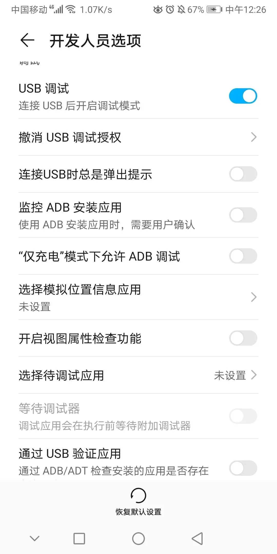 我们可以编译完成后打包成apk文件发送到你的手机进行安装运行,但我建议还是手机连上数据线在线调试比较好,省去很多时间也非常方便。手机连接电脑后打开USB调试,这里以华为荣耀V10手机作为参考。