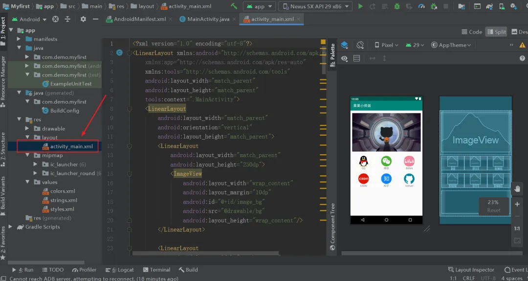 在实际应用中线行布局和相对布局是最常用的,一般自己写的APP布局都相对比较简单,所以这里我们使用线性布局。打开APP配置文件中的activity_main.xml,就可以在这里面愉快的编程了。如果你之前没有玩过Android Studio也没有关系,左边修改右边预览多试试几次就大概明白了。
