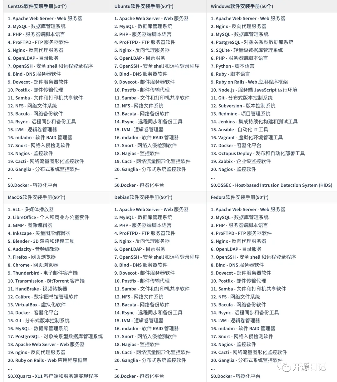 总共整理CentOS,Ubuntu,Windows,MacOS,Debian,Fedora 最流行的50个开源软件的安装手册。加入星球免费更新。