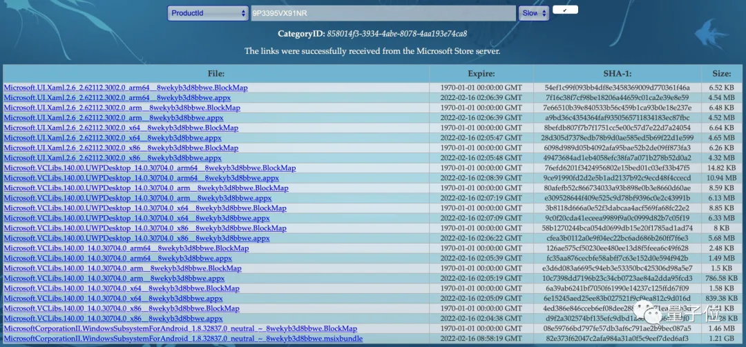 首先进入网站https://store.rg-adguard.net,分别选择ProductID、Slow,在搜索框中输入9P3395VX91NR,点击确定。