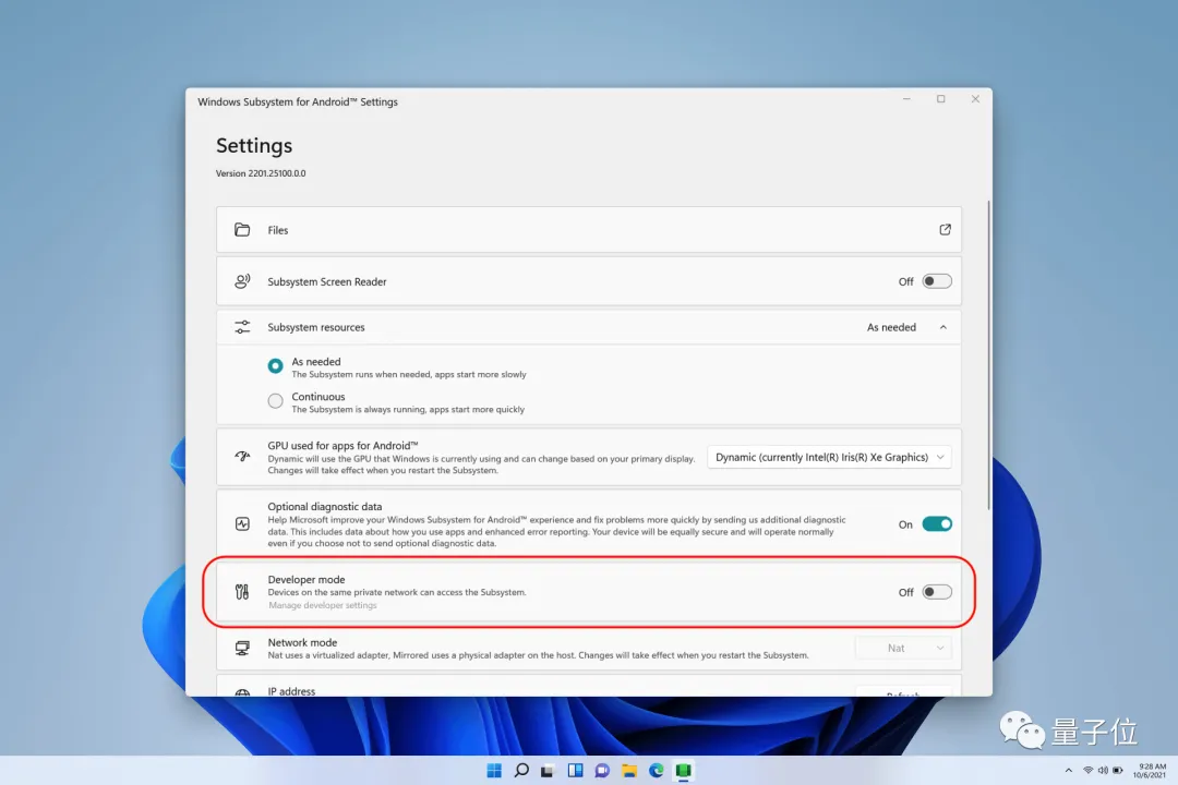 点击“开始”菜单,选择所有应用,找到Windows Subsystem for Android™️ Settings,启用开发者模式,并找到子系统的IP地址。