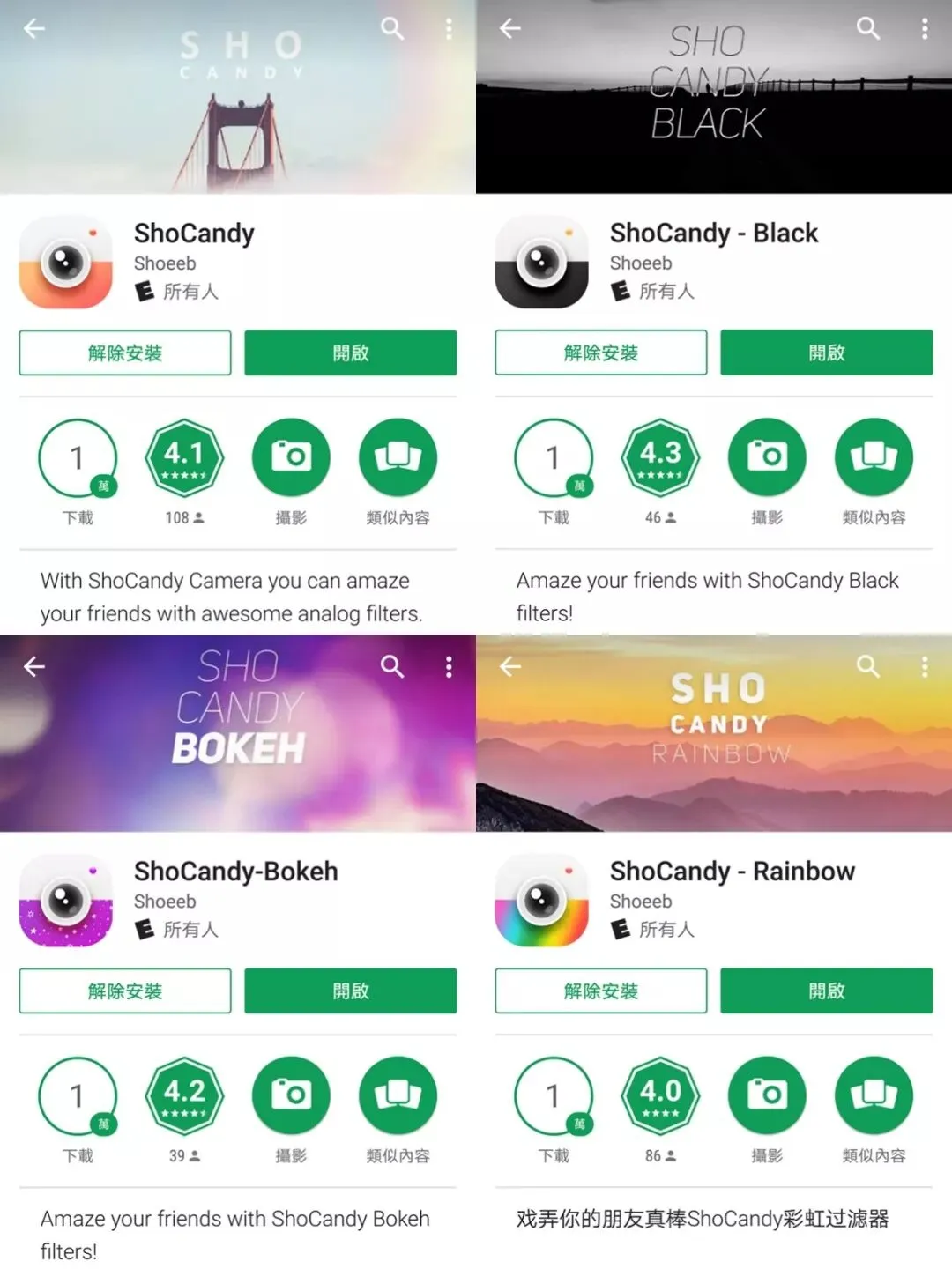 这是一套支持实时滤镜的相机app,总共4款,整体UI也比较美观,没有任何广告,没有任何内购。大部分滤镜适合女生但也有一款专门为男生定制的,里面的贴纸跟滤镜的数量都是相当赞的。