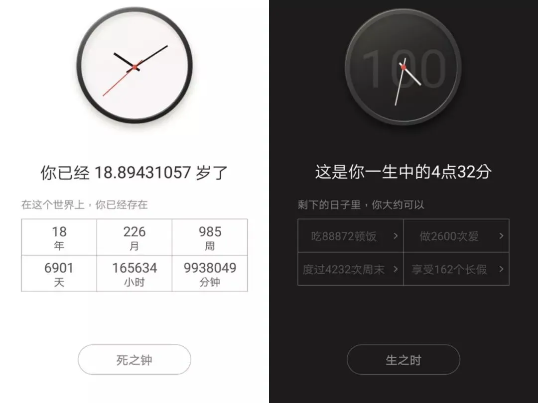 这是刚进入app 的主界面,名为生之时、死之钟,第一次启动要预设一下自己死的年龄,我也不知道自己怎么描述初看这2个界面时的心理震撼,不知道你有没有。