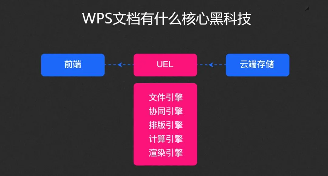 另外,我们注意到,在底层技术与前端应用之间,WPS 文档采用了五个引擎相结合的UEL(统一引擎层)作为核心支撑层。