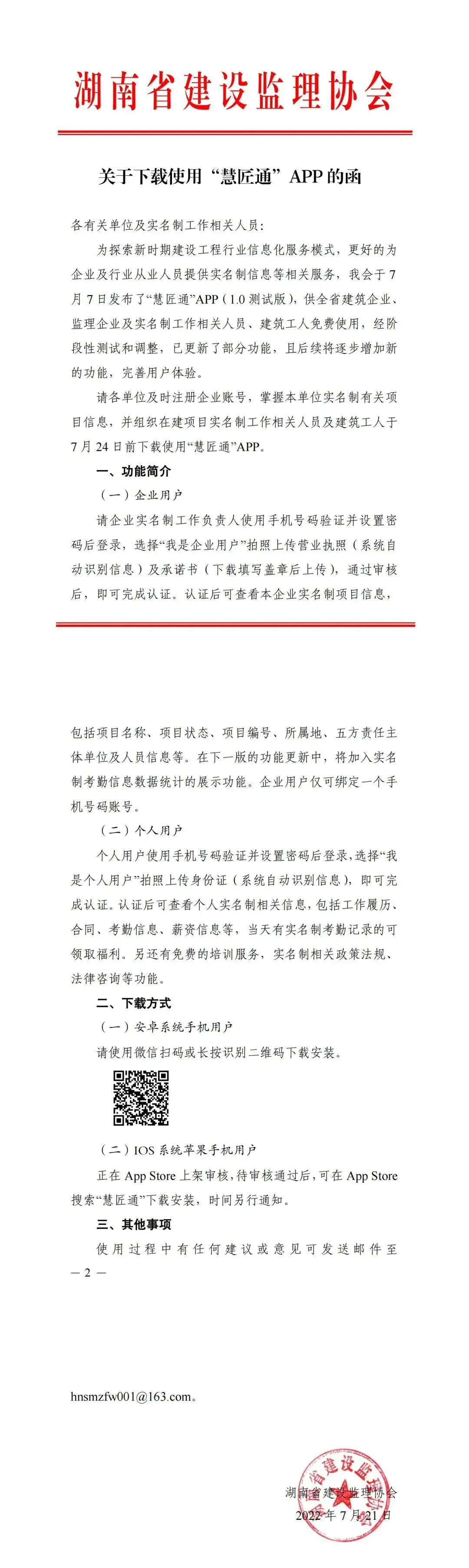协会文件 | 关于下载使用“慧匠通”APP的函 已关注 关注 重播 分享 赞 视频详情 视频点击进去可点击右下角图标放大观看 微信号| HuNanJLXH 电话|0731-84446302 地址|长沙市雨花区高升路268号