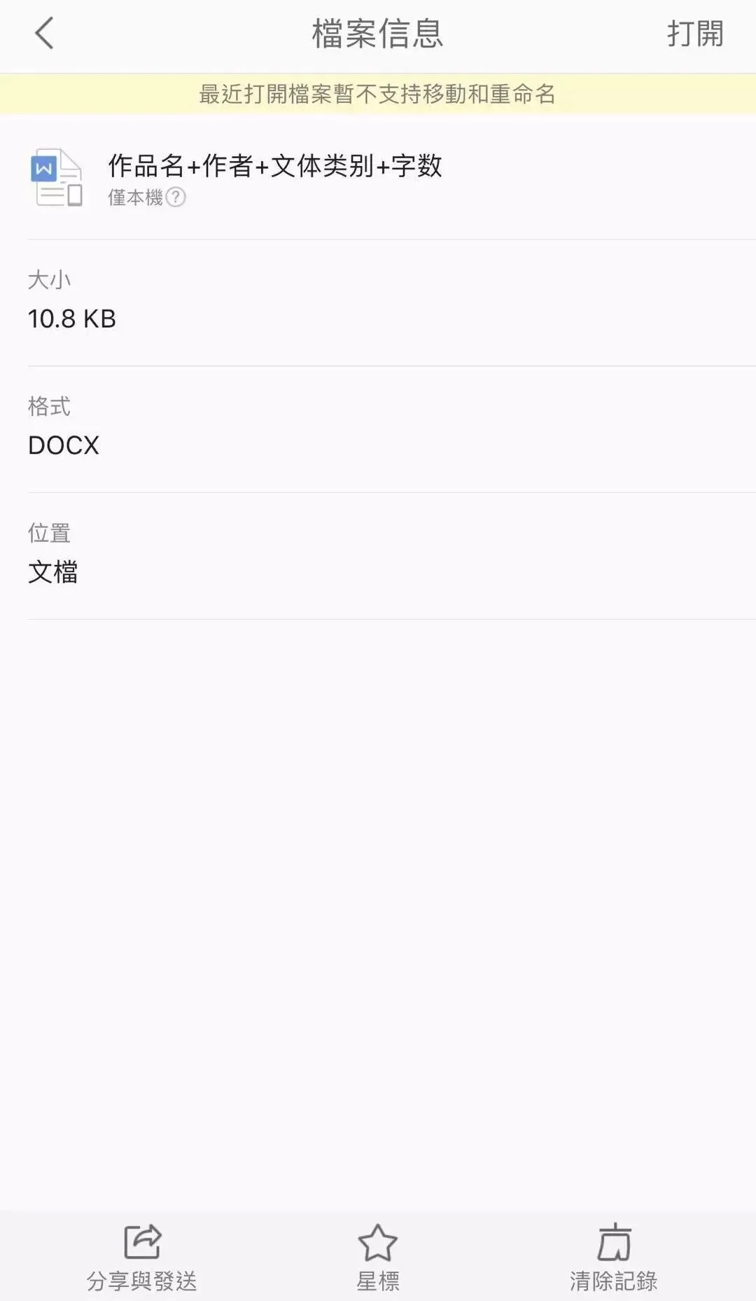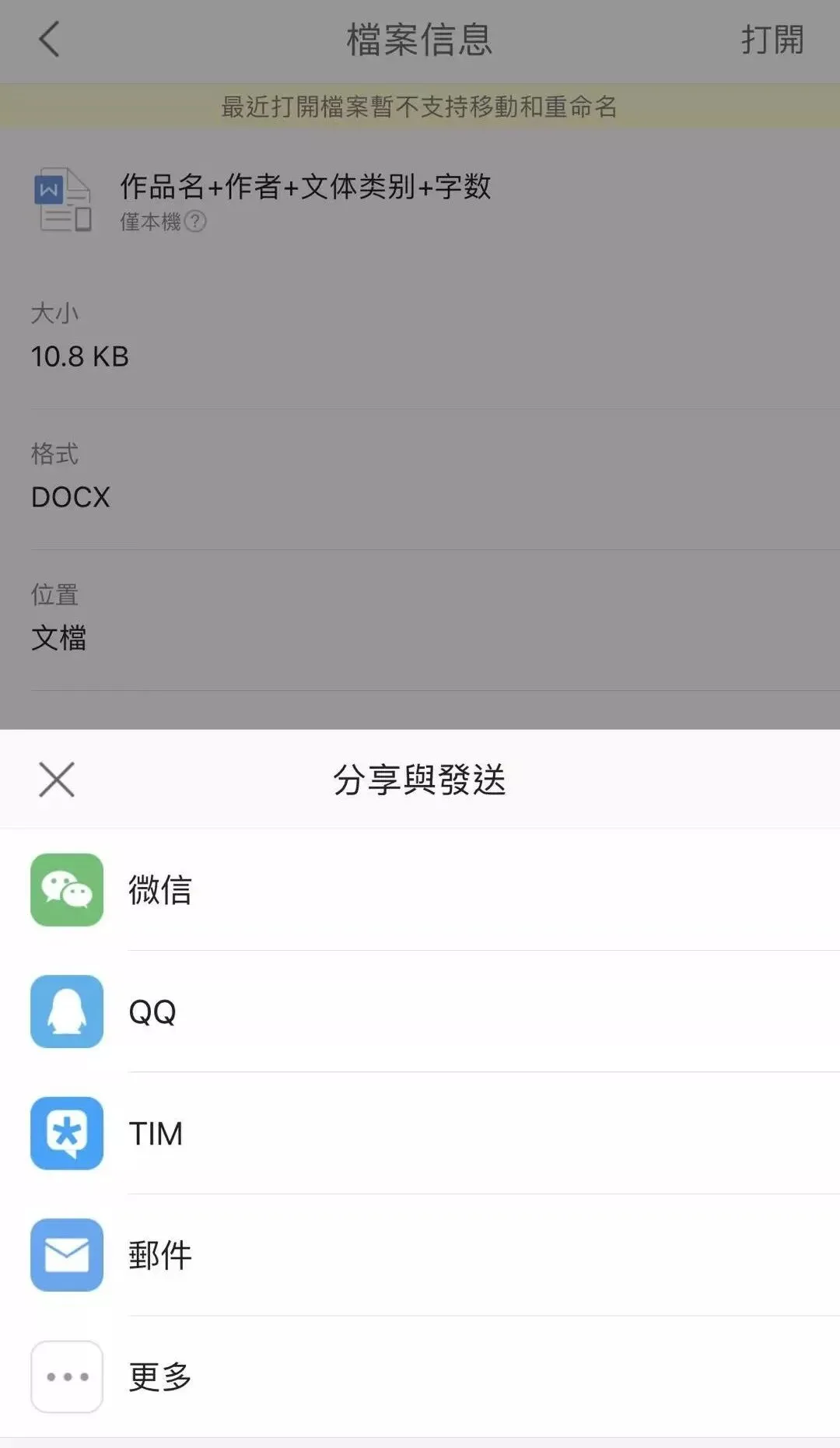 6、若使用WPS进行文本编辑,在本机文档中选择投稿word文档,左滑选择分享,即可转跳到邮箱界面,参照上文步骤填写收件人、主题、正文等信息,选择发送即可。