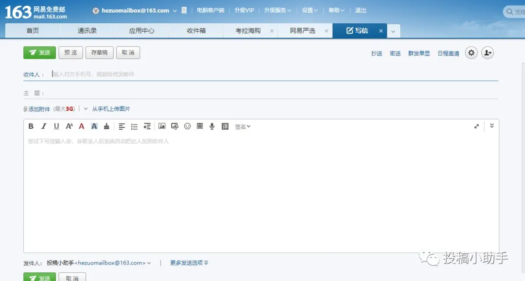 1、打开邮箱app,在收件人处填写要投稿刊物的邮箱地址,请仔细检查,千万不要写错。
