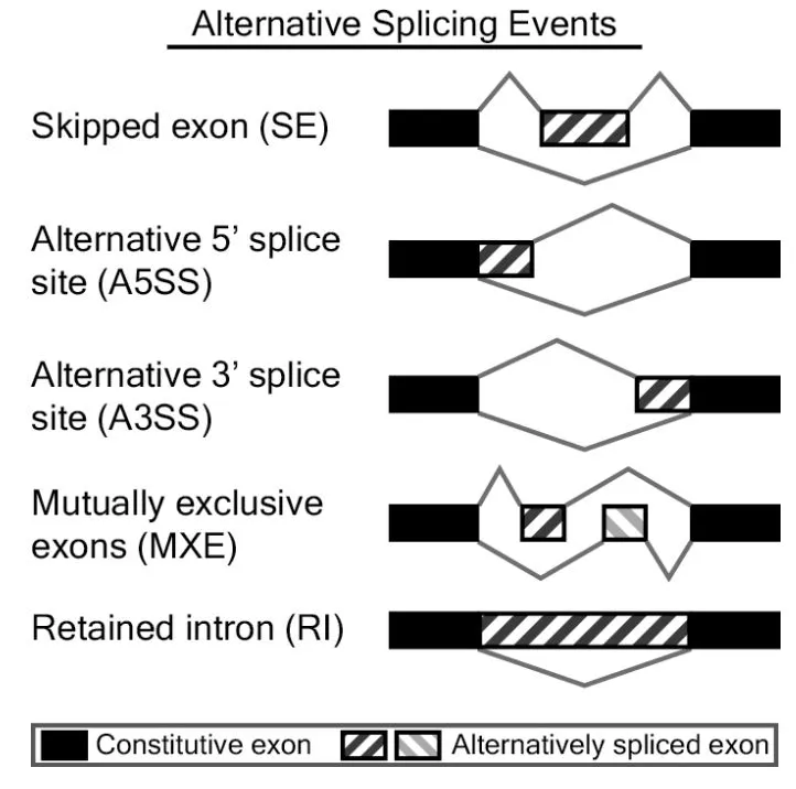 Multivariate Analysis of Transcript Splicing (MATS)软件列出5种可变剪切,分别是skipped exon (SE)外显子跳跃,alternative 5′ splice site (A5SS)第一个外显子可变剪切,alternative 3′ splice site (A3SS)最后一个外显子可变剪切,mutually exclusive exons (MXE)外显子选择性跳跃和 retained intron (RI)内含子滞留,示意图在官网,如下: