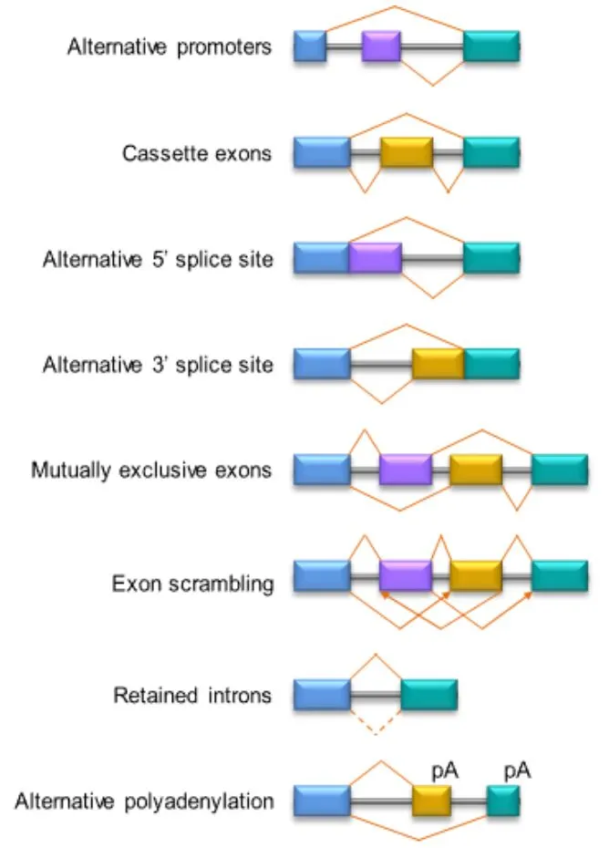 可变剪接(Alternative Splicing,AS)是指从一个mRNA前体中通过不同的剪接方式,对外显子和内含子进行组合,产生不同的mRNA剪接异构体的过程。高等真核生物中的可变剪接极大地拓展了基因功能的多样性,是调节基因表达和产生蛋白质组多样性的重要机制。