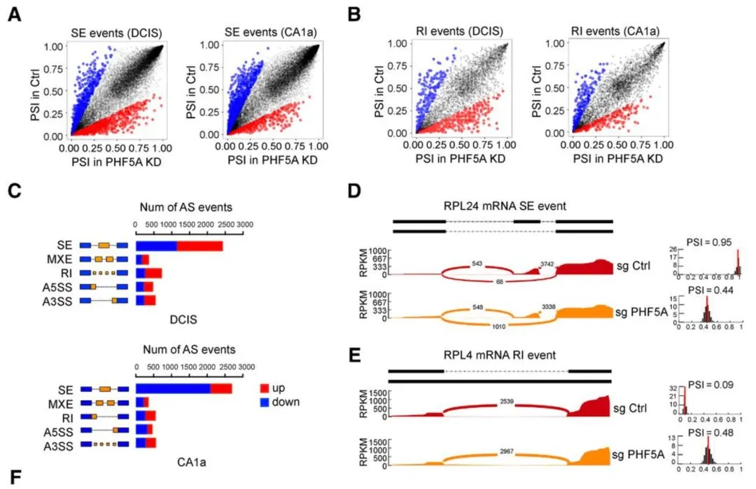 可变剪切在癌症领域研究不多,但重要性毋庸置疑,主要是因为技术手段限制,值得介绍的经典文章,比如邵志敏教授的题为“PHF5A Epigenetically Inhibits Apoptosis to Promote Breast Cancer Progression.”利用CRISPR-Cas9文库技术对RNA结合蛋白进行系统性功能筛选,发现了乳腺癌生存依赖的的剪切因子PHF5A . TCGA、METABRIC、KMplot以及本中心的研究队列显示,PHF5A在乳腺癌组织中普遍存在高表达,并且其高表达指示着较差的预后。生物学功能上,PHF5A缺失会导致癌细胞增殖、迁移和成瘤能力显著受损。该文章的测序数据在 SRP139147 ,然后走RNA-seq分析流程,比较cancer cells (CA1a or DCIS) 和noncancer cells (MCF10AT or MCF10A)差异分析,虽然作者文章主要是关心那1,542 manually curated RBPs ( RNA-binding proteins) ,不过最后落脚点仍然是可变剪切: