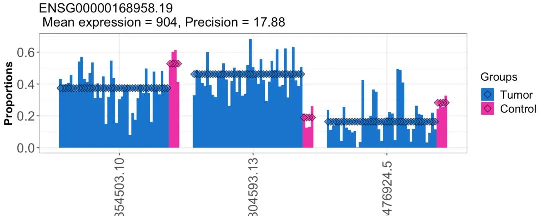 所有的统计学显著的可变剪切形式都会可视化在一张图里面,也可以自己别出心裁的使用其它可视化方法。我们随机展示其中一个结果(MFF基因):