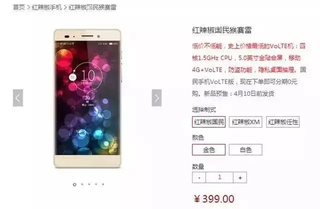 说到中低端VoLTE手机的代表,国产品牌尚不止360一家,早在360 F4发布的前一天,也即本月20日,国产品牌小辣椒就抢先一步发布了支持VoLTE技术的手机——国民猴赛雷。与360 F4 599元的价格相比,小辣椒在这款国民猴赛雷的定价上更显“良心”,这款手机只需要399元。