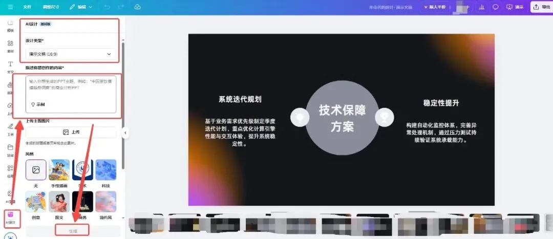 注意点:这个输入内容有字数限制,字数过多时,需要缩减等生成后在ppt手动编辑。
