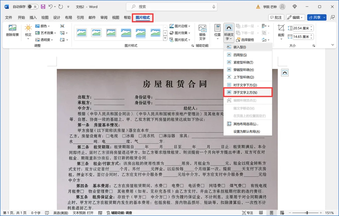 首先在Word中插入一张图片,然后选择图片,在【图片格式】选项卡下选择环绕方式为【浮于文字上方】,如下: