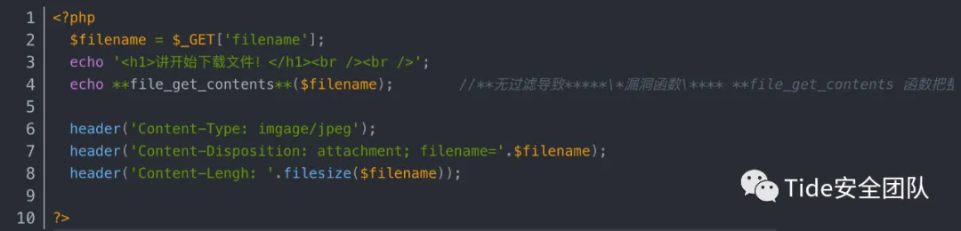 如下图所示,一个有文件下载功能的正常网站,同时还会从浏览器接收文件名,file_get_contents函数把整个文件读入一个字符串中并输出,代码未对接收的文件名进行过滤,用户可控制变量,将存在任意文件下载漏洞。