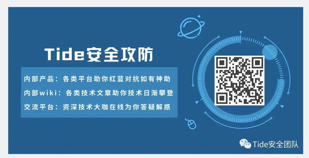 Tide安全团队正式成立于2019年1月,是新潮信息旗下以互联网攻防技术研究为目标的安全团队,团队致力于分享高质量原创文章、开源安全工具、交流安全技术,研究方向覆盖网络攻防、系统安全、Web安全、移动终端、安全开发、物联网/工控安全/AI安全等多个领域。