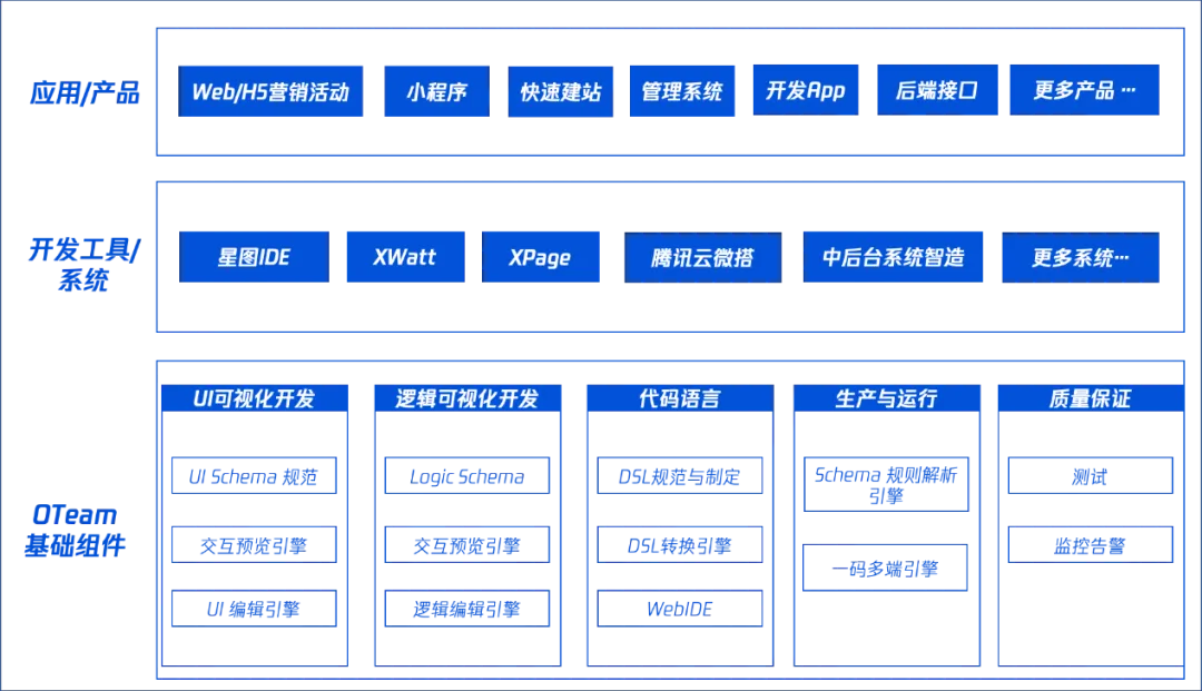 腾讯将各个事业部的低代码平台进行整合,推出了OTeam平台。它是真正意义上的低代码平台,包含了:UI可视化、逻辑可视化、DSL代码语言、生产和运行模块、质量保障模块,以及配套的IDE开发工具。