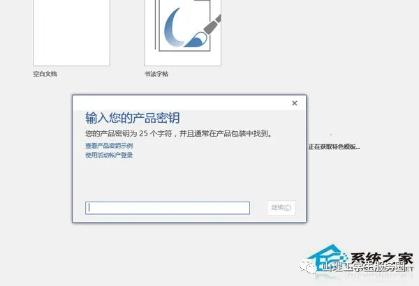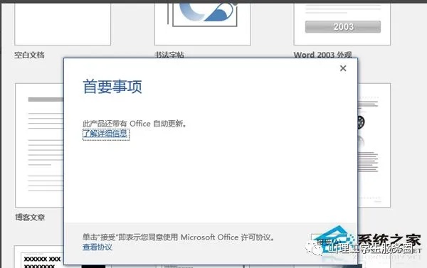 4、打开Office的某个应用,这时它会提示我们输入你的产品密钥,直接关闭这个窗口,在接下来的弹出窗口中点击【接受】,这时,我们的Office就完成了激活工作。再次打开Word 可以看到Office 2016已激活。