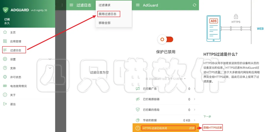 打开软件后可以视个人情况先设置这两项,禁用过滤日志(可以有效的降低软件对手机内存的占用)。关闭 HTTPS 过滤(开启后可能某些网站无法访问)。