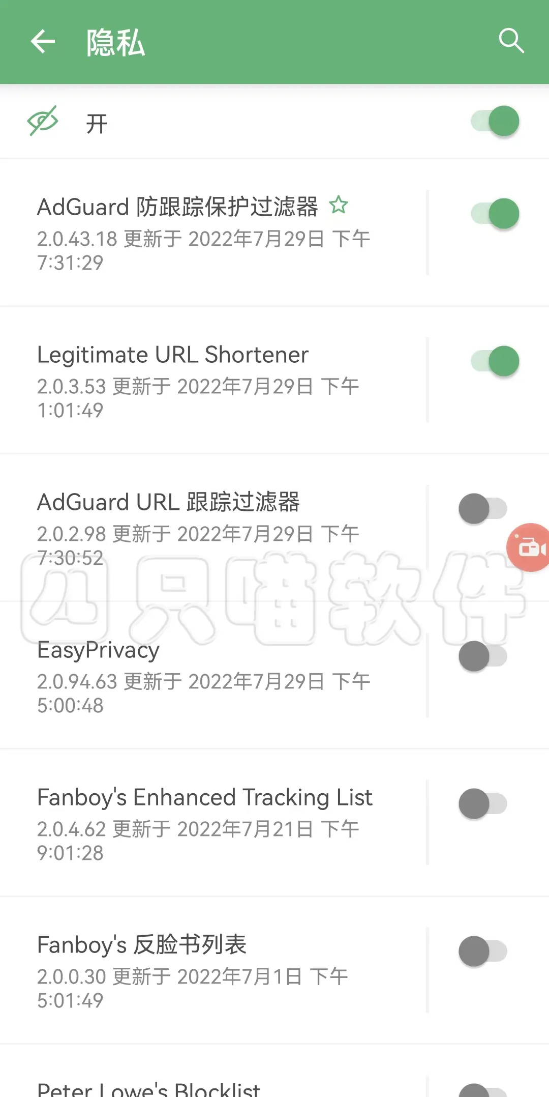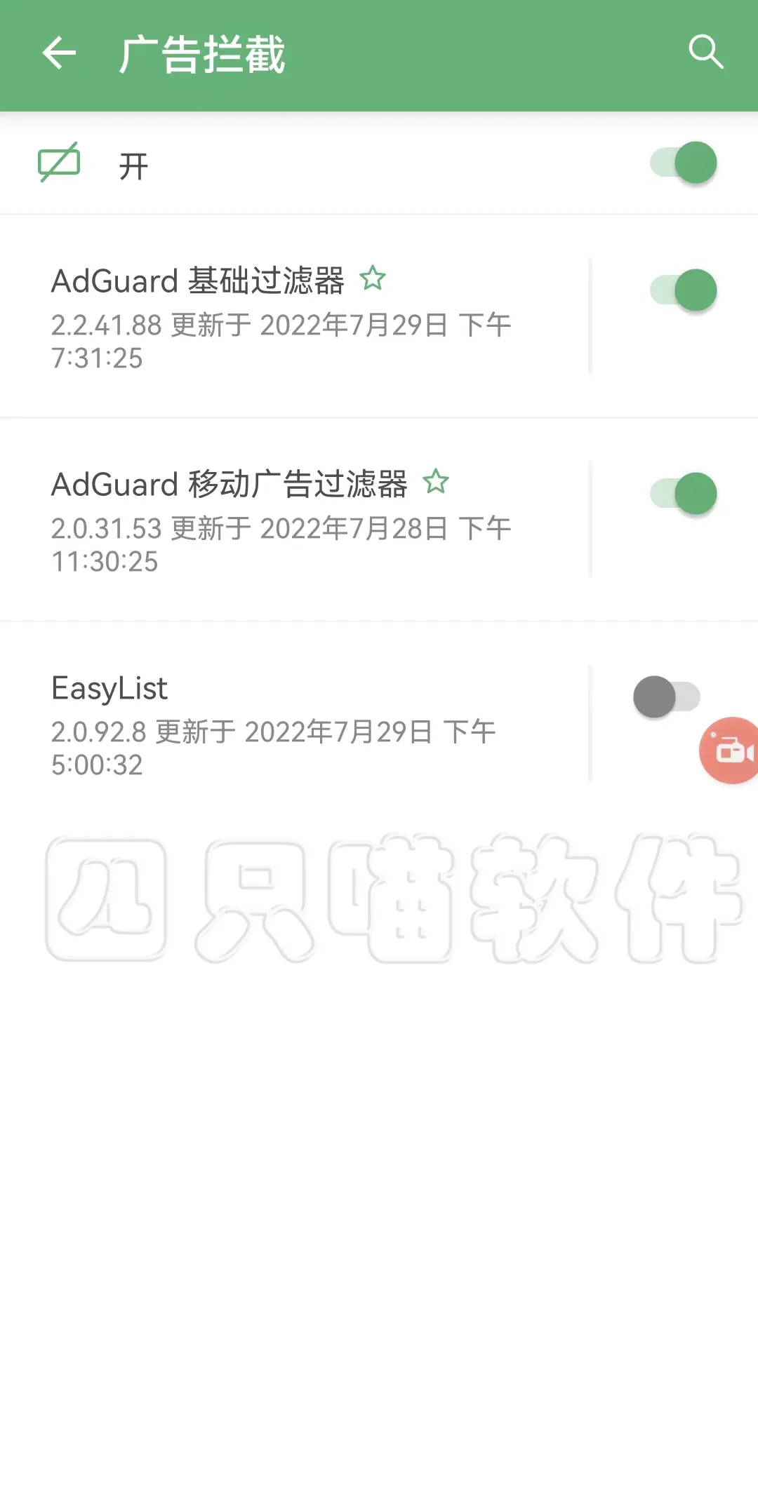 广告拦截是默认打开的。不过这个默认的功能强度较弱,点击规则订阅,全部选择后点击更新。更新完成后会发现有上万条拦截规则。