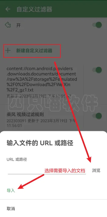 接下来设置自定义过滤器,点击新建自定义,点击浏览,把我准备好的五个TXT文档逐一导入到过滤器内,记得点击受信任。