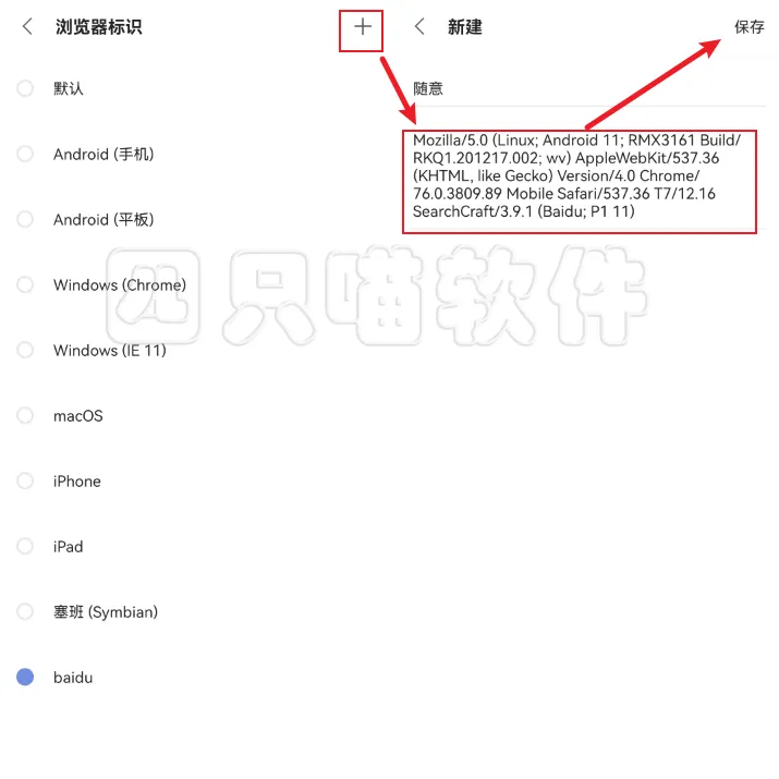 点击设置-通用-浏览器标识,点击右上角的加号,把下面这串字符复制进来,然后点击搜索引擎,将搜索引擎设置为百度即可。
