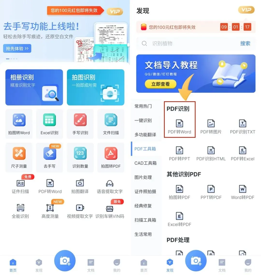 下载打开软件后,点击发现按钮,选择PDF工具箱,我们可以在PDF识别中找到PDF转Word。点击导入文件即可。