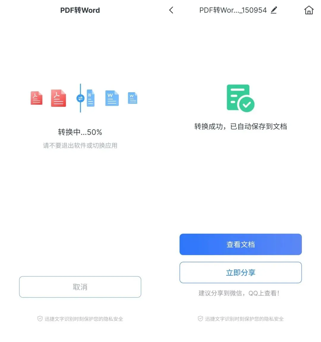 选择好文件后,我们就可以对文件进行转换处理了~转换完成后,可以查看文件,也可以分享给微信或者QQ好友~